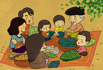 - Mọi người đều rất vui vẻ, quây quần cùng nhau gói
