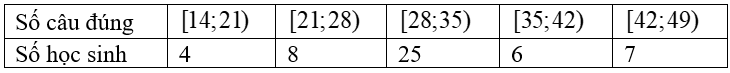 Số câu trả lời đúng một bài thi trắc nghiệm môn Toán gồm 50 câu của lớp 11A ở một trường THPT như sau:
