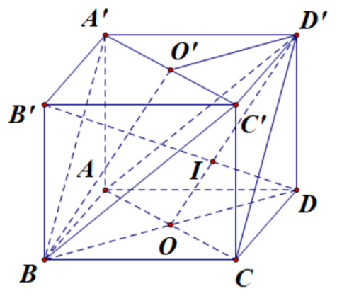 Khi đó \(\left\{ \begin{array}{l}I \in B'D\\I \in D'O \subset (D'AC)\end{array} \right. \Rightarrow I\) là giao điểm của đường thẳng DB’ và mặt phẳng (D’AC).