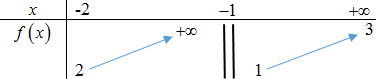 \(\mathop {\lim }\limits_{x \to + \infty } f(x) = 3,\,\,\mathop {\lim }\limits_{x \to - {1^ + }} f(x) = + \infty \,\, \Rightarrow \) Đồ thị có 1 TCN là \(y = 3\) và 1 TCĐ là \(x = 1\).
