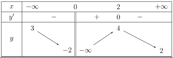 Quan sát bảng biến thiên, thấy đồ thị có hai tiệm cận ngang là y = 2 và y = 3, tiệm cận đứng là x = 0.
