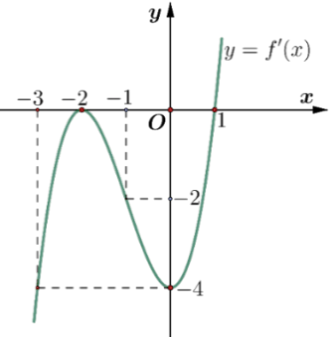Cho hàm số y = f(x) có đạo hàm trên $\mathbb{R}$ và hàm số y = f’(x) là hàm số bậc ba có đồ thị là đường cong trong hình vẽ.