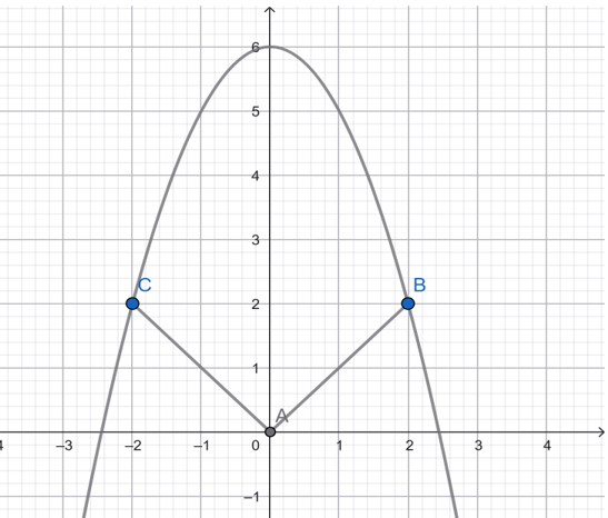 Xét hình phẳng (H) là miền giới hạn bởi các đoạn thẳng AB, AC và một phần parabol (P) như hình vẽ. Biết A trùng gốc tọa độ, B(2; 2), C(-2; 2). Parabol (P) có đỉnh I(0;6) và qua 2 điểm B, C.