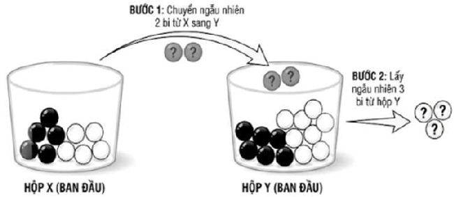 Hộp X có 5 bi đen và 5 bi trắng, hộp Y có 6 bi đen và 8 bi trắng. Bạn H lấy ngẫu nhiên 2 viên bi từ hộp X bỏ sang hộp Y, sau đó tiếp tục lấy ngẫu nhiên 3 viên bi từ hộp Y (hình vẽ minh họa).