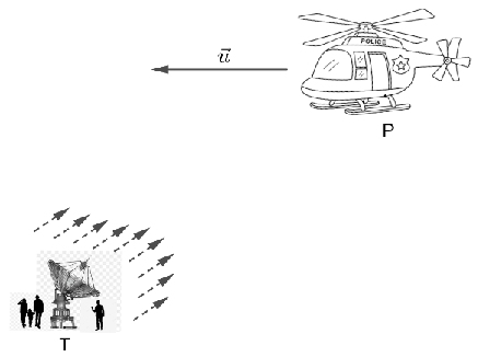 Trong hệ trục Oxyz (đơn vị trên mỗi trục là km), một số người gặp nạn đã chế tạo ra máy phát tín hiệu cứu nạn đặt tại vị trí T(-2; 1; 4) với bán kính phát tín hiệu tối đa là 10 km. Cách đó có một chiếc trực thăng tuần tra của cảnh sát không gian đang bay từ vị trí P(8; 3; 14) theo phương vectơ $\vec{u} = (5;-2;1)$ với tốc 200 km/h (tham khảo hình vẽ).